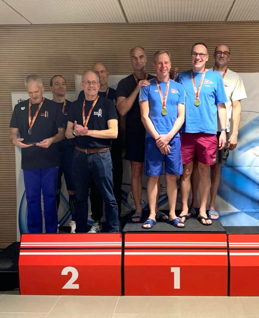 Mit drei Deutschen Meistertiteln war Karsten Dellbrügge (AK 60) der Titelhamster der Speyerer. Er siegte über 800m Freistil in neuer Deutscher Mastersrekordzeit von 09:42,30 min vor Michael Prüfert von der SG Dortmund in 09:58,88 min ebenso wie über 400m Freistil in 04:41,49 min ebenfalls vor Michael Prüfert in 4:46,25 min. Dir dritte Goldene gab es mit der Staffel über 4x200m Brust in der Besetzung Thomas Ligl, Konrad Ligl, Karsten Dellbrügge und Heiko Zinsmeister. Sie siegten in 12:13,36 min von der SG Neukölln (12:41,42 min). Weitere Silbermedaillen über 200m Brust im Einzel gab es für Heiko Zinsmeister (AK 50) in 2:57,50 und Konrad Ligl (AK 60) in 3:12,04.